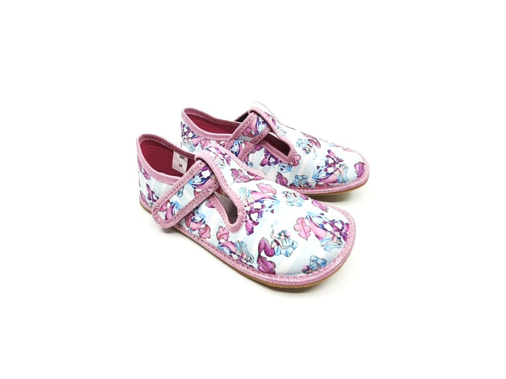 Zapínání je na suchý zip, díky tomu obuv dobře sedí i na užší kotník. Doporučujeme dětem s užší nohou. Bačkory se nehodí pro vyšší nárt a baculatější nožičku.