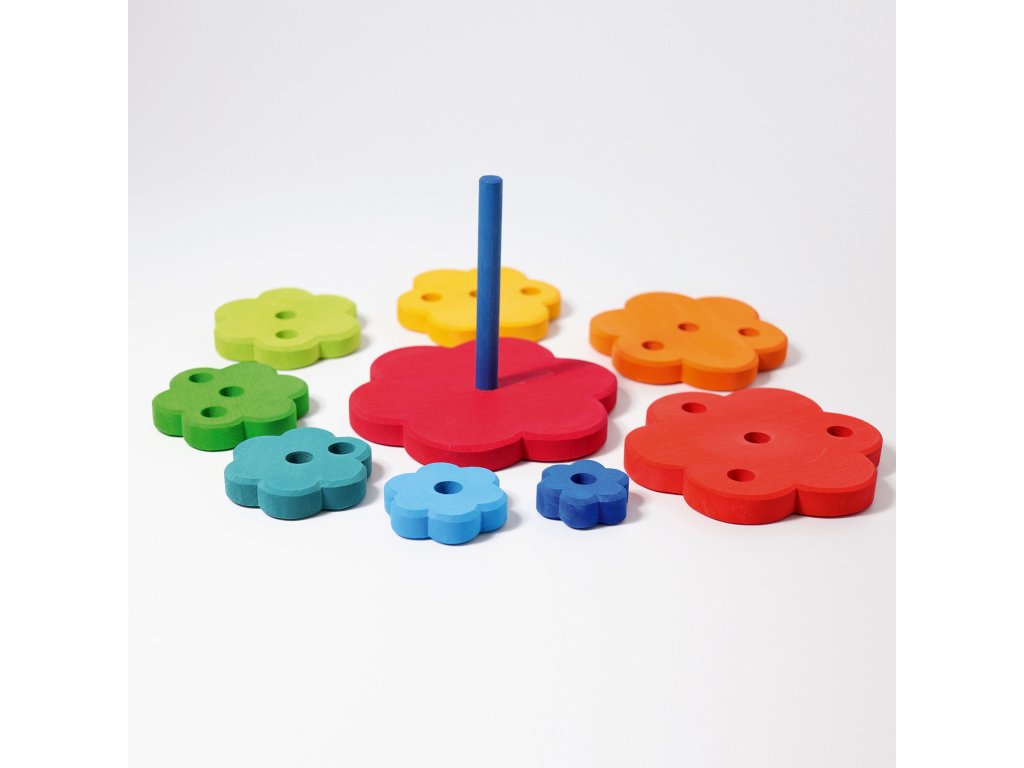 Květinová disková věž je hračka i dekorace: barvy a velikosti květin lze třídit a lze je skládat na sebe a stavět zpět do pyramidy. Tak se trénuje jemná motorika těch nejmenších.