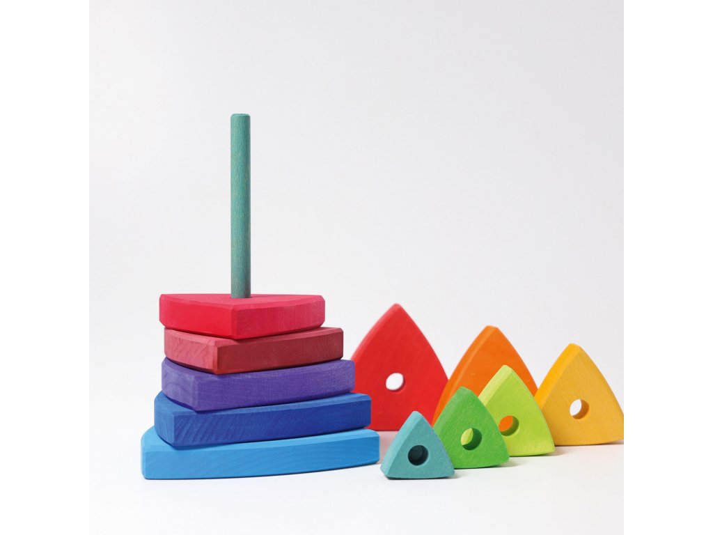 Skládací pyramida trojúhelníky je především úžasně barevná a vysoká. Celých 25 cm! Trojúhelníky mají různé velikosti a také barvičky. Děti je mohou libovolně na tyč nasunovat a tím mění nejen tvar, ale také barevné kombinace. Hra s pyramidou rozvíjí nejen jejich motoriku, ale také formuje cit pro barvy a různé barevné kombinace. Sestavte si z pyramidy malé schůdky úplně až nahoru na vrcholek. Jednotlivé dílky nasunovací pyramidy mají sílu 2 cm a proto se později dobře začleňují do staveb. Z trojúhelníčků je možné skládat také plošně různé obrazce a dráhy. Vhodné pro děti od 1 roku.