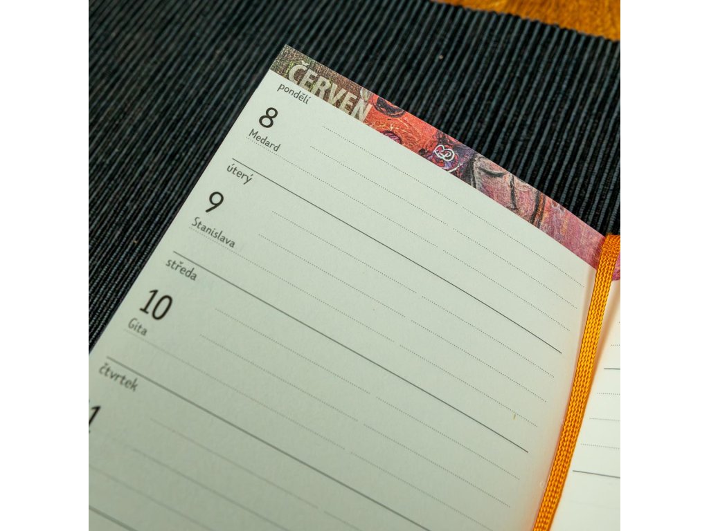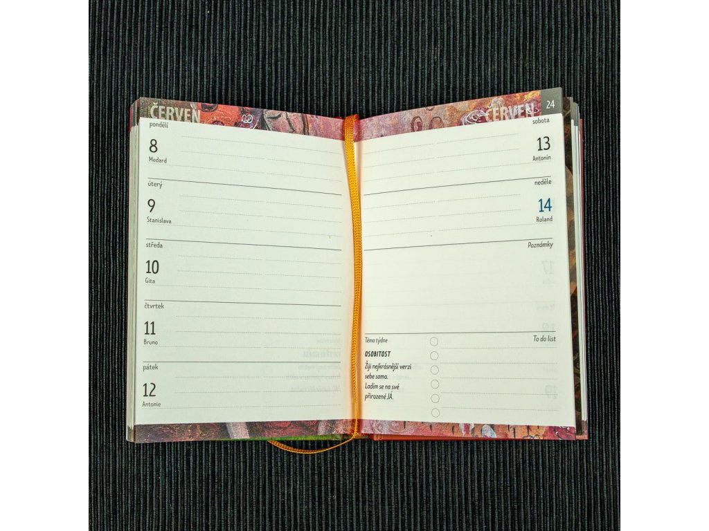 - Týdenní přehledný diář na dvoustraně s prostorem na poznámky, nápady a úkoly.