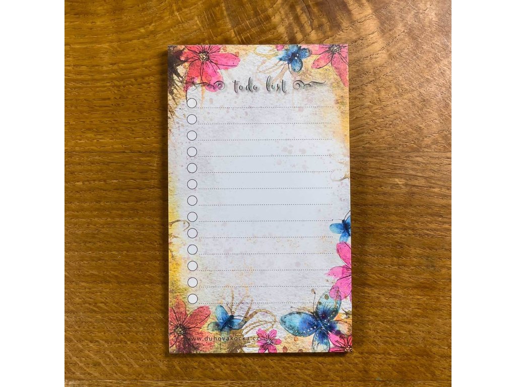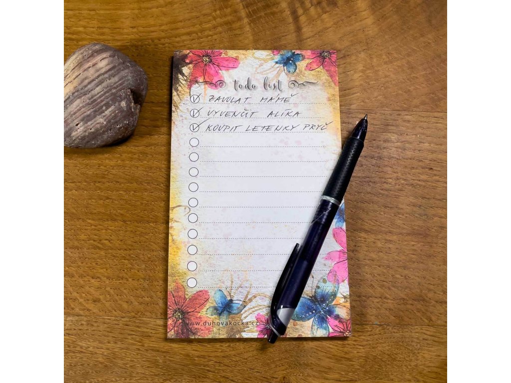 Praktický trhací bloček pro zapisování úkolů nebo seznamů. Formát 10 x 17 cm. Lepená vazba. 50 listů.