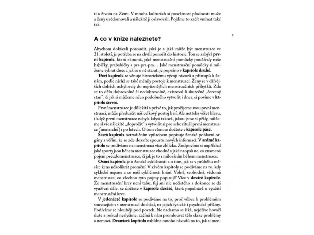 Kniha samotná ovšem nemá moc cokoli změnit. Záleží na každé ženě, jestli se do procesu proměny vnímání své menstruace aktivně zapojí. Cesta vede přes pochopení, že být ženou není utrpení, je to naopak velký dar a záleží jen na nás, jak s tímto darem naložíme. Je dobré si uvědomit, že my ženy jsme jiné než muži. Ani lepší, ani horší, zkrátka jiné. Máme své cykly a rytmy a už pouhé pochopení tohoto, nám vnese do života velkou úlevu.