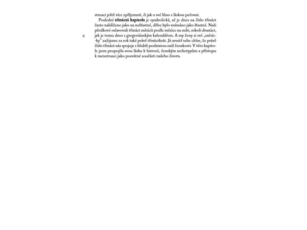 "Děkuji autorce za komplexní zpracování často tabuizovaného tématu menstruace. Doporučuji jako povinnou četbu ženám, které se zajímají o osobní rozvoj a téma ženskosti. Jak jinak než skrze porozumění menstruaci se můžeme spojit samy se sebou. Ke knize je ještě sympatický bonus o rituálu Menarché (uctění první menstruace). Velmi čtivé a inspirativní."