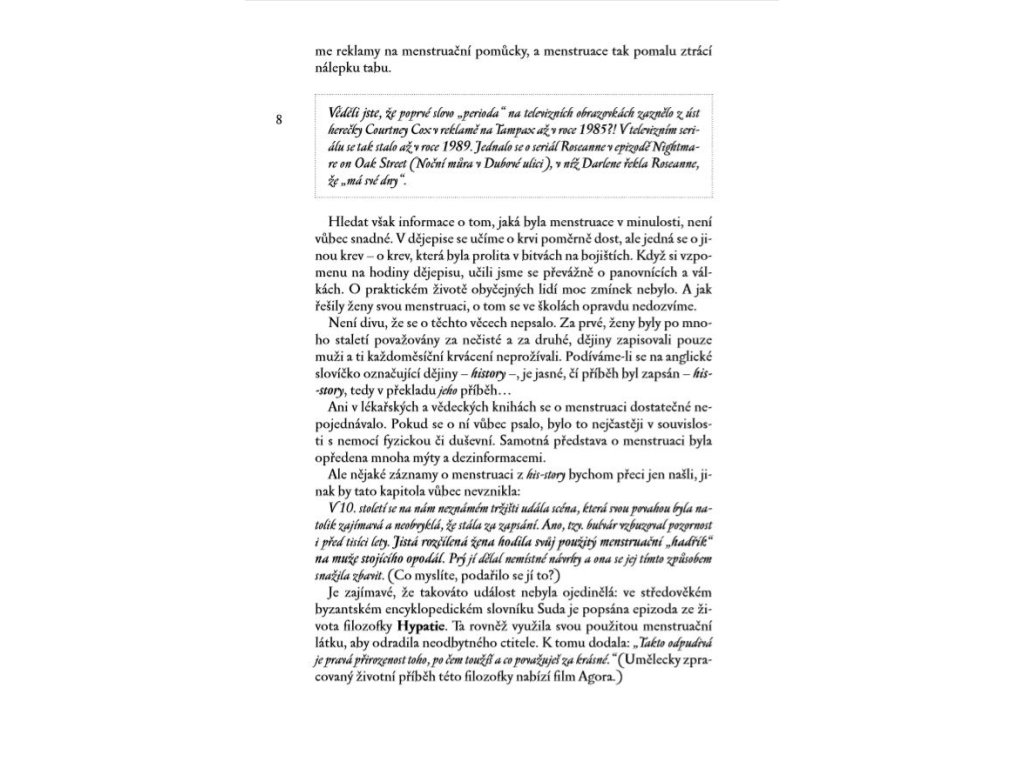 "Je to taková encyklopedie menstruace, velice zajímavé čtení. Po přečtení se budete na měsíčky těšit : )"
