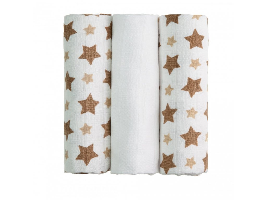 Sada 3ks BIO bambusových vysokogramážních plen s potiskem (design sady: béžové hvězdičky) o rozměru 70x70cm značky T-tomi. Pleny jsou vyrobeny technologií dutinného tkaní typu tetra (tj. dvouvrstvé tkaní "do čtverců"). Díky spojení materiálu, ze kterého jsou pleny vyrobeny (70% bambusová viskóza/30% BIO bavlna) a technologii tkaní jsou bambusové pleny mnohonásobně savější, měkčí a jemnější než klasické bavlněné pleny.
