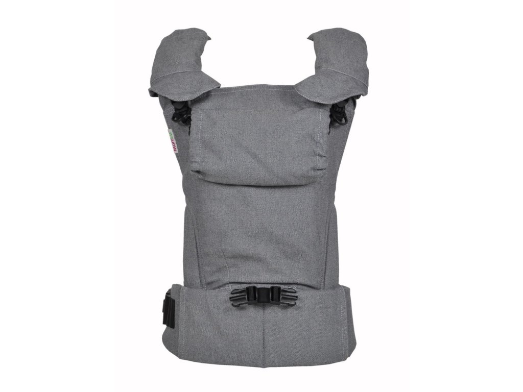 Od okamžiku, kdy miminko začne postupně samo fixovat hlavičku (2.měsíc), používá se klasické boční upnutí popruhů. Spony na bederním pásu lze poté elegantně vyjmout a odložit.