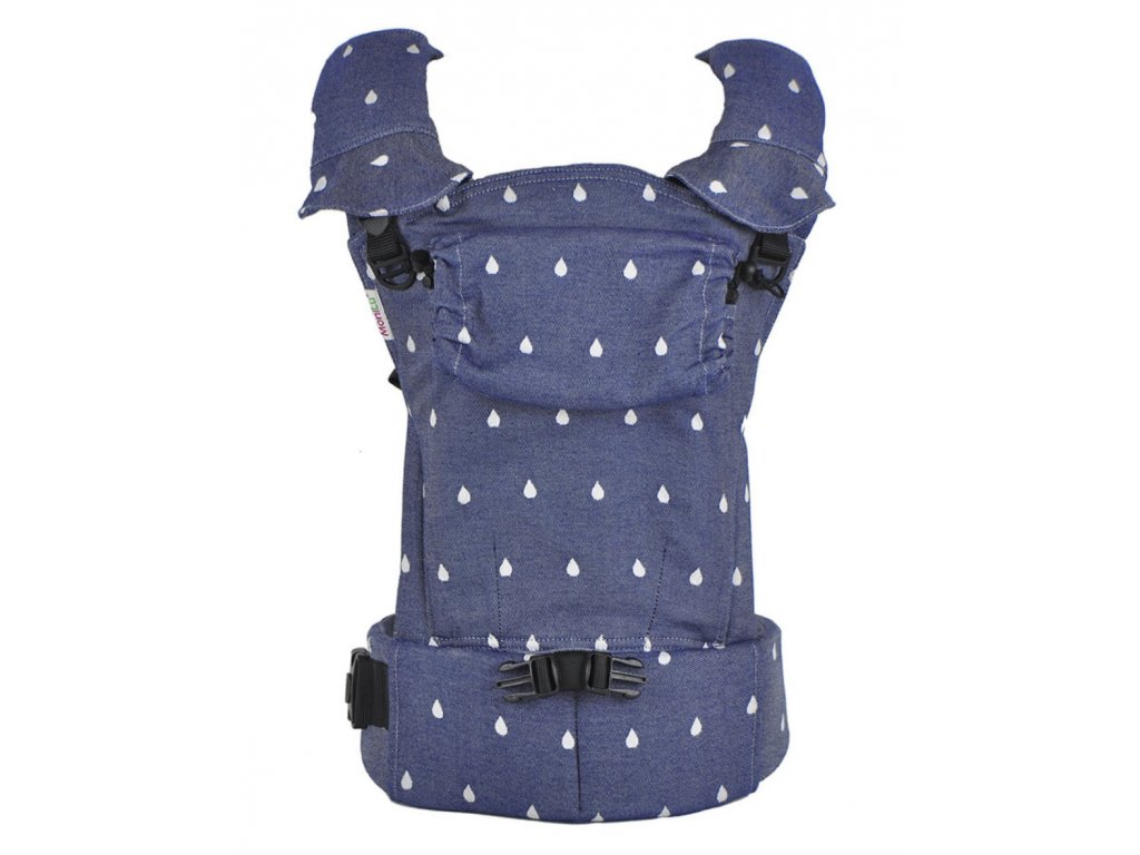 Od okamžiku, kdy miminko začne postupně samo fixovat hlavičku (2.měsíc), používá se klasické boční upnutí popruhů. Spony na bederním pásu lze poté elegantně vyjmout a odložit.