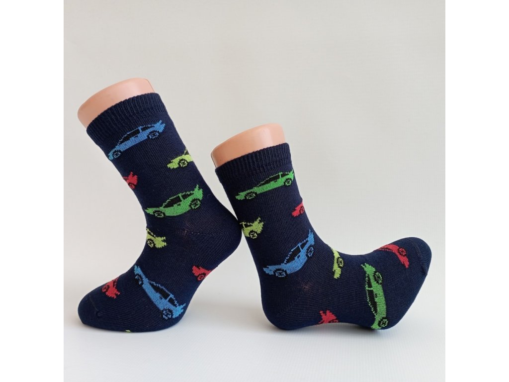 Dětské bavlněné ponožky s obrázky aut. Ponožky jsou vyrobeny z jemné dlouhovlákné bavlny a díky přidanému elastanu se skvěle přizpůsobí tvaru dětské nožičky. Ponožky mají komfortní jemné lemy, které se nezařezávají. Špička a pata ponožek jsou zesílené.