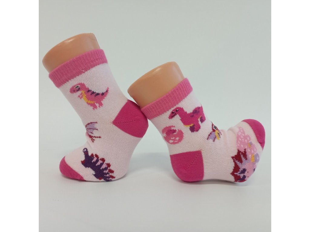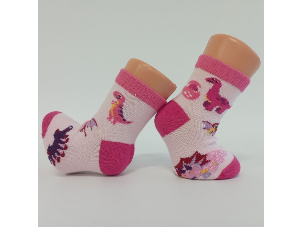 Dětské bavlněné ponožky s obrázky dinosaurů. Ponožky jsou vyrobeny z jemné dlouhovlákné bavlny a díky přidanému elastanu se skvěle přizpůsobí tvaru dětské nožičky. Ponožky mají komfortní jemné lemy, které se nezařezávají. Špička a pata ponožek jsou zesílené.