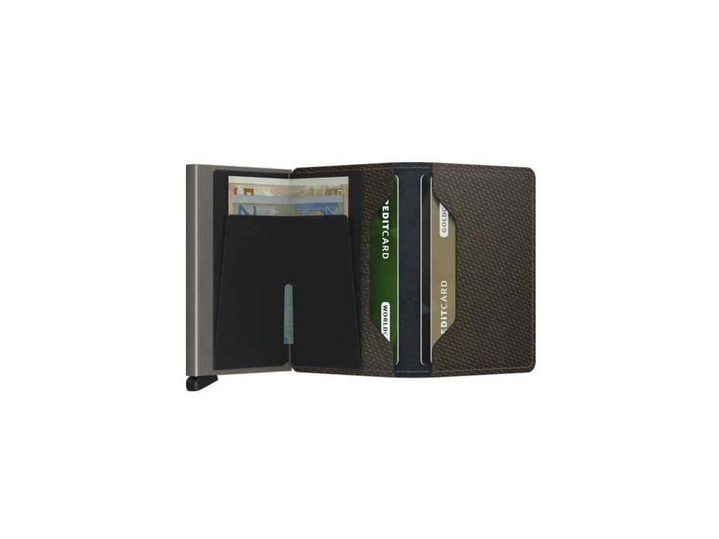 Slimwallet ztělesňuje moderní pojetí klasické peněženky. Díky tenkému provedení skvěle padne do každé kapsy. Nabízí však dostatek prostoru pro platební karty, vizitky i hotovost. Patentovaný mechanismus umožňuje vysunout karty jedním jednoduchým pohybem. Hliníková výztuha chrání karty před ohýbáním, lámáním i nežádoucí bezdrátovou komunikací.
