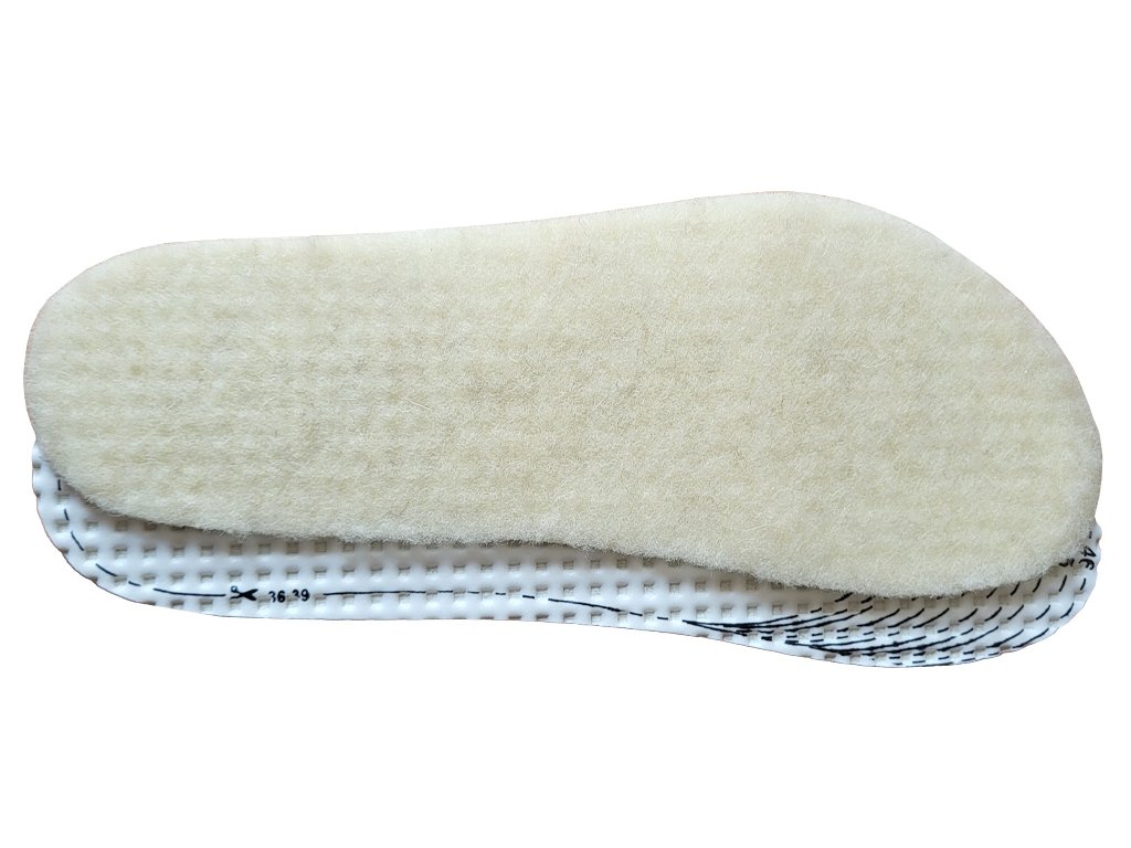 - Nášlapná vrstva – přírodní ovčí rouno: izoluje teplo a odvádí vlhkost.